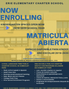 Las inscripciones a Kindergarten se encuentran ahora disponibles para el ciclo escolar de 2019-2020, únete a nuestra comunidad de estudiantes, maestros y padres! Somos una escuela chárter gratis con programas bilingüe en Humboldt Park, ofrecemos programas de lectura, escritura y conversación en español e inglés. Nos orgullece contar con clases en grupos pequeños y con programas de desarrollo social y emocional para todos los estudiantes. Ofrecemos clases de gimnasio al interior y exterior de la escuela, clases de música, así como programas de aprovechamiento después de clases. En Erie valoramos la educación, por lo que nos enfocamos en fomentar la educación media superior de nuestros estudiantes desde el principio, cada año se organizan excursiones escolares a universidades además de ofrecer apoyo a padres y estudiantes para después de graduarse.