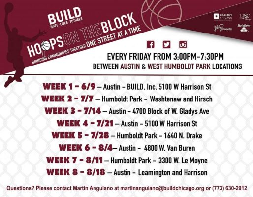 With support from State Farm and LISC Chicago, BUILD is proud to offer our 6th installment of Hoops in the Hood, which we are now branding as “Hoops on The Block“, bringing community-centered athletics to Austin and Humboldt Park, while “taking back” streets that have experienced violence, creating safe spaces for youth and adults to build positive relationships, and fostering a sense of community.