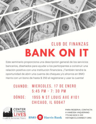 Únase a nosotros para nuestro Club Financiero mensual en Center for Changing Lives. El tema de este mes: Cuenta En Eso patrocinado por BMO Harris Bank. Este evento es gratis y bienvenido a todos!