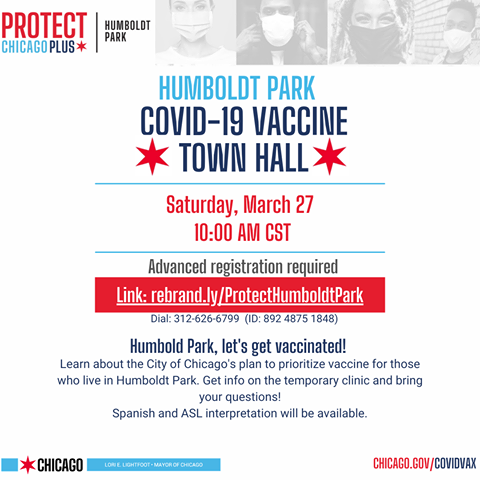 Learn about the City of Chicago’s plan to prioritize vaccine for those who live in Humboldt Park. Get info on the temporary clinic and bring your questions.