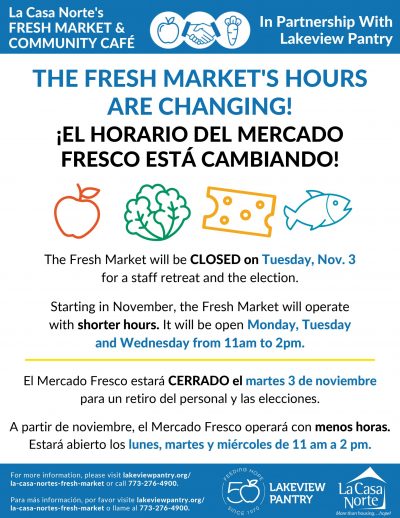El Mercado Fresco, la despensa de comida de La Casa Norte, ubicada en 3533 W North Ave, continúa ofreciendo alimentos frescos y nutritivos libre de costo a la comunidad durante estos tiempos. Debido a la mayor demanada, tambien estamos operando los martes de 11 a 3 PM mientras dure la crisis de COVID-19, además de los lunes y miércoles.