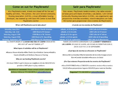 Este verano, PlayStreets, tendrá eventos y las calles estarán cerradas para actividades divertidas y saludables. Este verano, Latin United Community Housing Association (LUCHA), una organización que proporciona viviendas accesibles, estará trabajando con Gads Hill Center para proporcionar cinco eventos de PlayStreets!