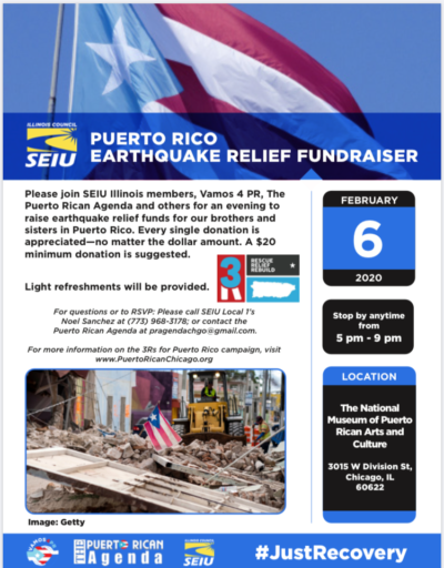 Feb 6 Puerto Rico Earthquake Relief Fundraiser 5:00 pm - 9:00 pm National Museum of Puerto Rican Arts & Culture 3015 West Division Street, Chicago Event Details Get Directions