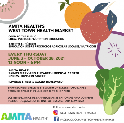 Oct 28 AMITA Health’s West Town Health Market 12:00 pm - 6:00 pm AMITA Health 2233 W. Division, Chicago Event Details Get Directions