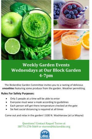 Our Block Garden 1500 N. Washtenaw, Chicago, IL, United StatesThe Bickerdike Garden Committee invites you to a tasting of delicious smoothies featuring some produce from the garden. Rules For Safety Purposes: Only 5 people at a time will be able to enter Everyone must wear a mask according to guidelines Each person will get there temperature checked at the gate Six feet social distancing […]
